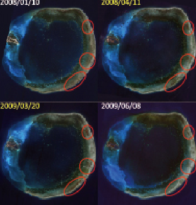 According to satellite image classification conducted from 2006 to 2013, coral, seagrass, silt and coral conglomerate distributions are in a cycle of successive changes. The atoll’s north crest and interior have exhibited significantly more changes; after comparing satellite images with ground truth data, it was discovered to consist of mostly coral and seagrass habitat. Variations in coral and seagrass coverage are attributed to changes in the macro environment such as water temperature, lighting and nutrient salt.