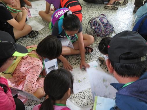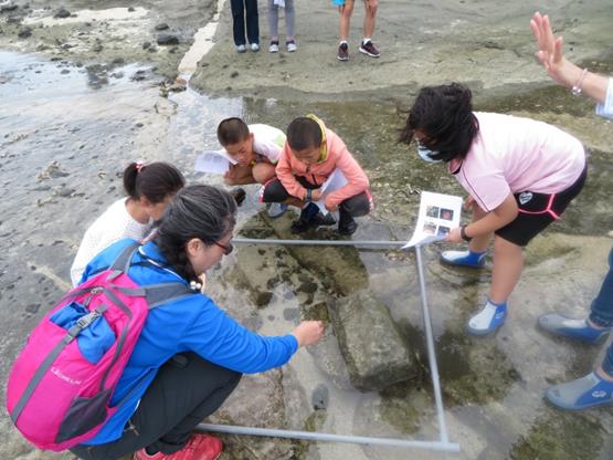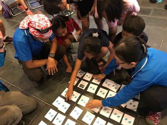 登上東吉嶼後,帶領同學們到虎頭山下的海蝕平台觀察潮間帶生物,透過觀察框的方式,讓學生可以更聚焦在調查範圍,觀察過程中也強調要尊重海洋生物,不可以用手碰觸、干擾潮間帶生物。最後在東吉遊客中心操作的「漁網最前限」課程,先讓同學們觀看3分鐘海洋生態影片,以連結前兩個活動,讓大家從海上航行、潮間帶觀察逐步的進入海底世界,接著,志工老師透過海龍王越來越少魚類跟他打招呼的情境,帶領同學們去思考魚類越來越少的問題,隨後五組同學們搖身一變成為捕魚公司,讓他們去討論如何在南方四島海域捕魚,並獲得最高收益。活動的一開始在志工老師刻意的鼓勵大家抓魚,許多的組別選擇流刺網、三層流刺網希望能漁獲滿滿,但也有組別選擇延繩釣認為比較友善環境,捕漁的過程中也逐漸產生差距,選擇流刺網的組別收穫滿滿、卻也因抓到保育類生物而損失慘重。因此,開始有組別選擇一支釣的魚法,除了減少抓到保育類的風險,也可以透過遊戲設計機制賣得較好的漁獲價錢。最後志工老師誘勸大家選擇非法的捕魚方式以獲得較高收益,不過同學們都不受誘惑,在旁協助的家長也大呼「魔鬼藏在細節中」,發現用非法毒魚、炸魚、電魚的方式,反而讓海中生態更快速的消失,表示學生們對於海洋保育、捕魚有深厚的認知。課程的最後也拿出實際使用的三層流刺網、延繩釣等漁具,讓大家知道不同漁具的樣貌、使用方式及對海洋生態產生的影響。